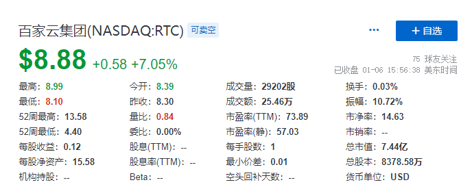 截至昨日(1月6日)收市,百家云集团(RTC)每股收报8.88美元,其市值为7.44亿美元。