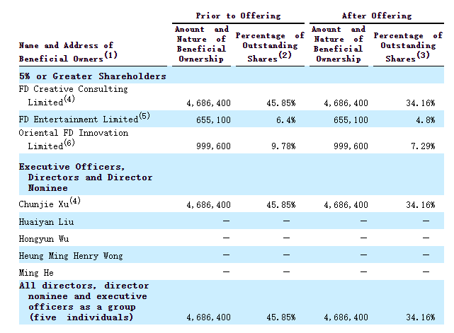 徐春捷 Chunjie Xu,通过FD Creative Consulting Limited持股45.85%;