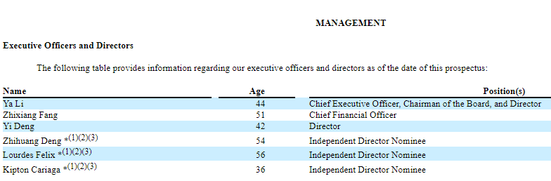 Mr. Deng has over 25 years of experience in legal practice in the PRC. He will serve as our independent director starting immediately upon the effectiveness of the registration statement of which this prospectus forms a part. Since June 2020, he has been appointed as the independent director and serving as the chairman of the remuneration committee and a member of each of the audit committee and nomination committee of Yik Wo International Holdings Ltd., a company listed on GEM of the Stock Exchange (stock code: 8659). He is responsible for, among other things, evaluating the performance of directors and senior management, monitoring the integrity of the company’s financial statements and annual reports and accounts, reviewing the company’s financial controls and risk management and internal control systems and making recommendations on any proposed changes to the board of directors to complement the company’s corporate strategy. In July 2019, Mr. Deng became a senior partner at Beijing Yingke (Fuzhou) Law Firm. Mr. Deng was a senior partner at Fujian Zhixinheng Law Firm from October 2005 to June 2019. Mr. Deng became a lawyer at Fujian Huawei Law Firm from April 2005 to October 2005. From April 1995 to March 2005, Mr. Deng was a prosecutor of Fujian Province Fuzhou City People’s Procuratorate.