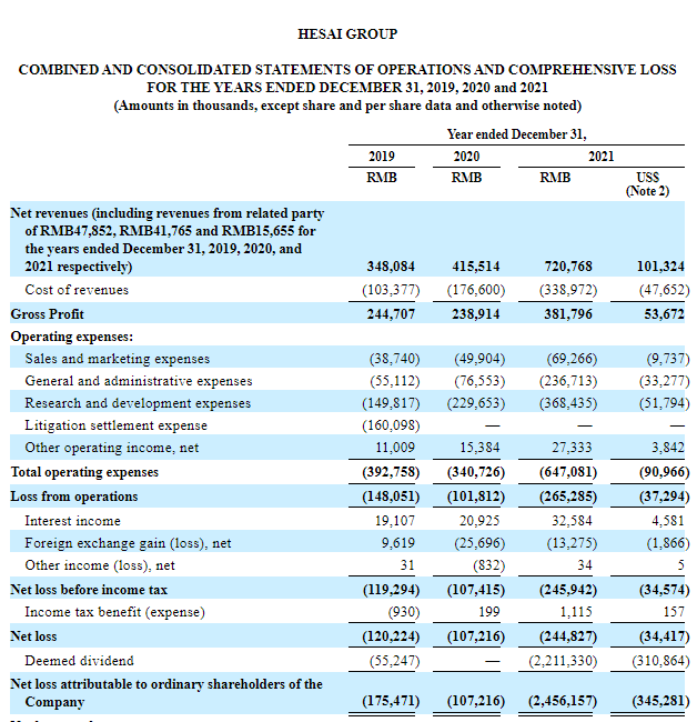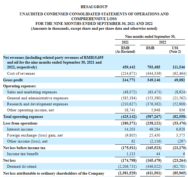 招股书显示,在过去的2019年、2020年、2021年和2022年前九个月,禾赛科技的收入分别为3.48亿、4.16亿、7.21亿和7.93亿元人民币,相应的净亏损分别为1.75亿、1.07亿、24.56亿和6.12亿元人民币。