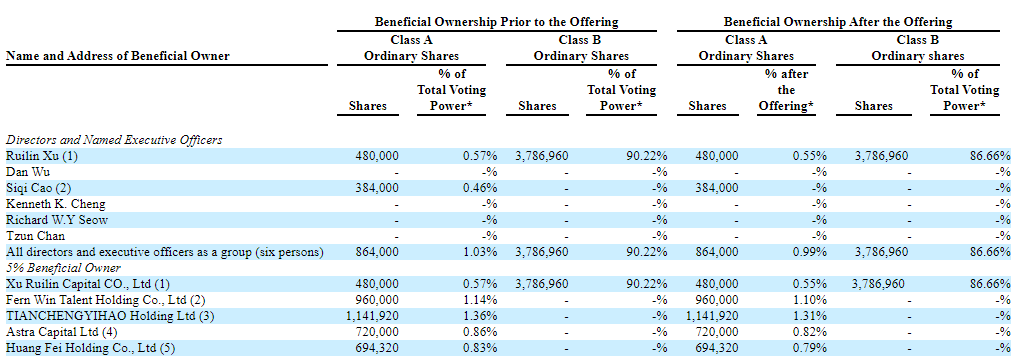 Fern Win Talent Holding Co., Ltd(曹斯棋Siqi Cao占40%,郝佳奇Jiaqi Hao占60%)持有A类股票96万股、占A类股票的11.69%、拥有1.14%的投票权;