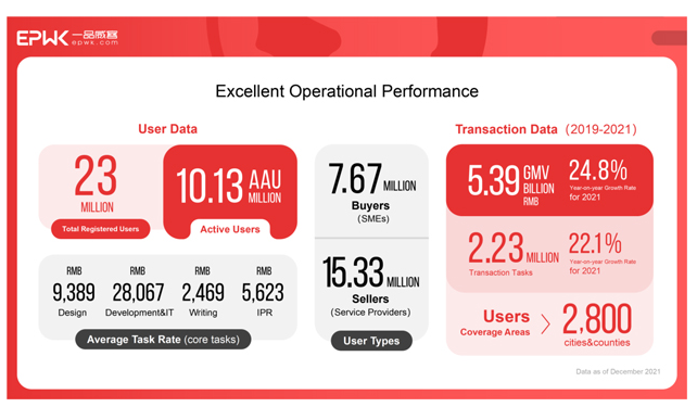 一品威客的市场平台www.epwk.com于2011年推出,自成立以来取得了显着增长。 公司的平台用户既是为工作寻找人才的买家,也是提供不同才能和技能的卖家。 公司目前拥有超过 2300 万注册用户,并提供广泛的目录,为各种规模的企业提供多样化的服务。 公司的年平均活跃用户(AAU)为1013万。