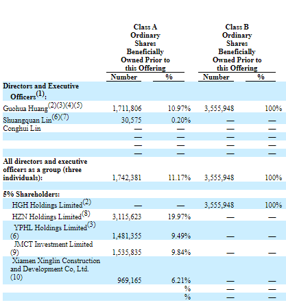 在上市前的股东架构中,控股股东黄国华Guohua Huang先生,持有177.1806万股A类股票、及全部的355.5948万股B类股票,分别占相应股票的10.97%、100%,合计持有526.7754万股、占全部股权的27.50%;