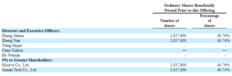 招股书显示,微巴士在上市前的股权架构中,郑家华 Zheng Jiahua,通过Micava Co., Ltd.持有40.76%;郑楠 Zheng Nan,通过Annan Tech Co., Ltd.持有40.74%。