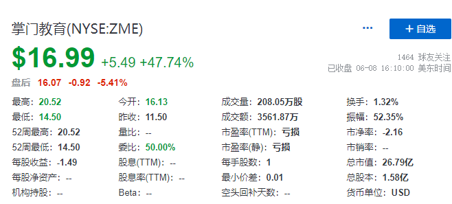 截至首日收市时间,掌门教育收报 16.99 美元,较发行价涨47.74%,目前其总市值大概26.79亿美元。