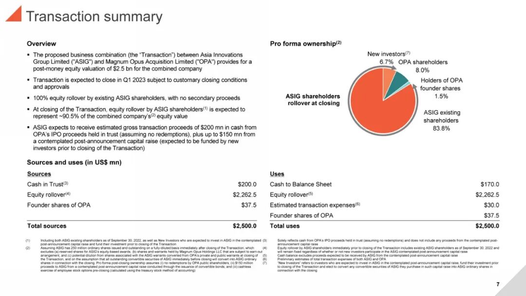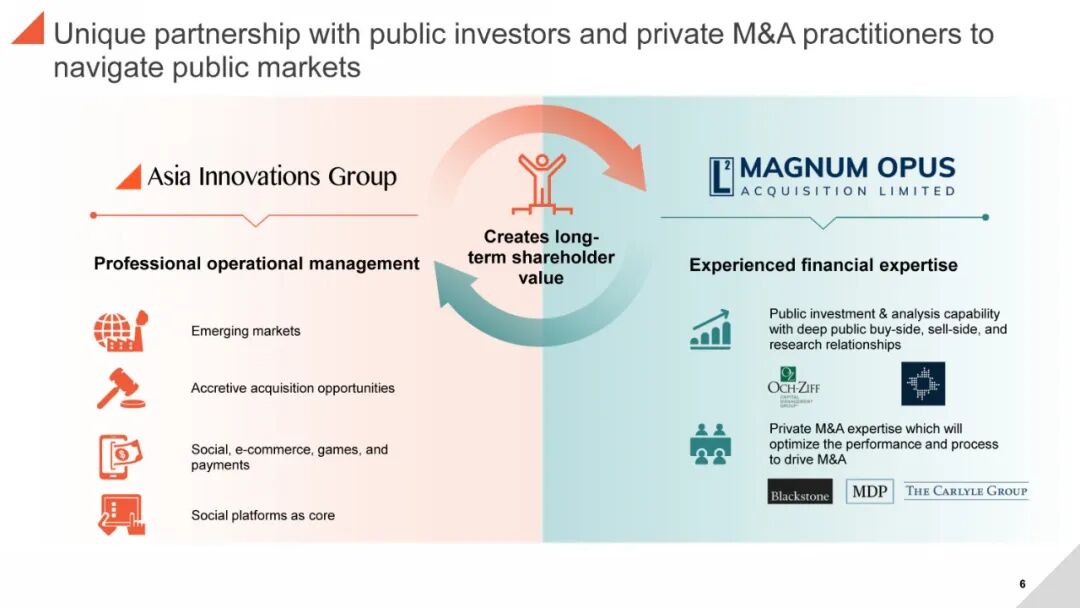 总部位于新加坡的亚洲创新集团Asia Innovations Group Limited(以下简称“亚创集团”),于2022年9月30日宣布已与美国纽交所SPAC(特殊目的收购公司)Magnum Opus Acquisition Limited(NYSE:OPA)签订了业务合并协议,预计2023第一季度内在美国完成上市。