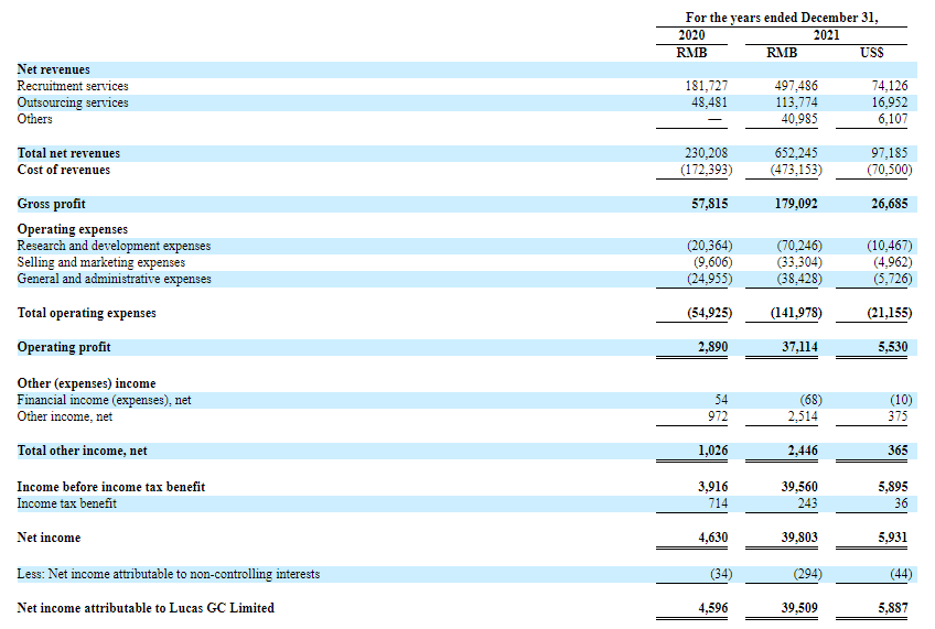 2023年2月28日,来自北京的人力资本管理服务提供商罗科仕科技(北京)股份有限公司的实质控股股东Lucas GC Limited(以下简称“罗科仕”)在美国证监会(SEC)公开披露招股书,股票代码 LGCL,拟在美国纳斯达克IPO上市。其早前于2022年11月21日在SEC秘密递表。