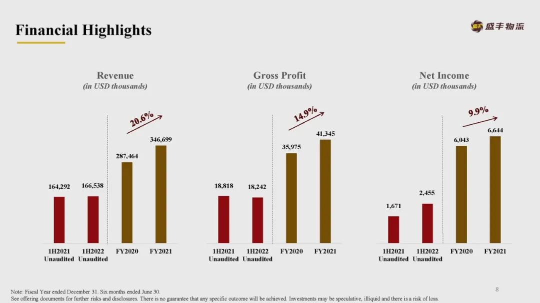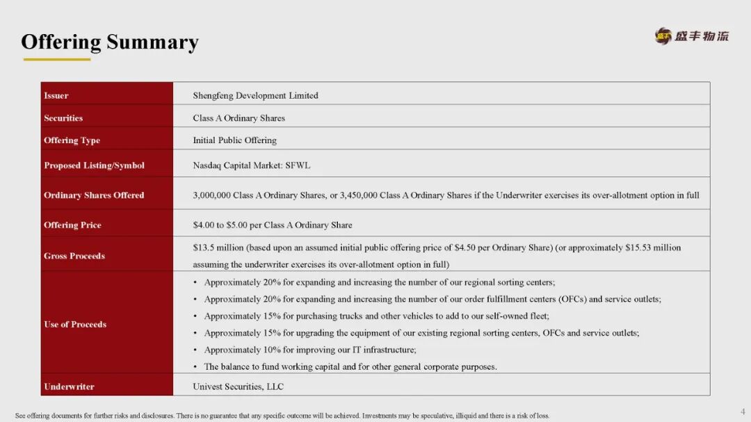根据招股书,盛丰物流计划发行300万股,另有15%的超额配售权,每股价格介乎4美元至5美元,最高募资1500万美元,