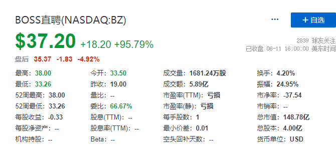 截至首日收市时间,Boss直聘收报 37.20 美元,较发行价涨95.79%,目前其总市值大概148.78亿美元。