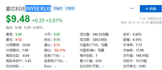 雾芯科技(RLX),周五(6月11日)股价收报9.48美元,自上市以来高位累跌72.91%。