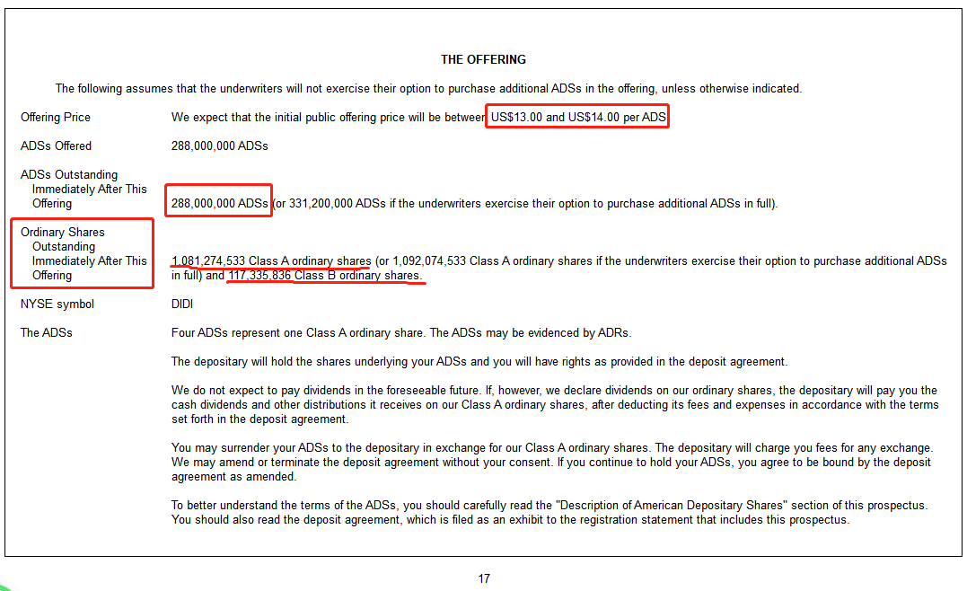 滴滴出行,此次全球发行 2.88 亿份ADS美国存托凭证 (每份ADS代表其0.25股普通股),每份ADS的发行价介于13.00美元至14.00美元,募资最高或达40.32亿美元。同时还授权承销商可额外购买4,320万份ADS(超额配售)。