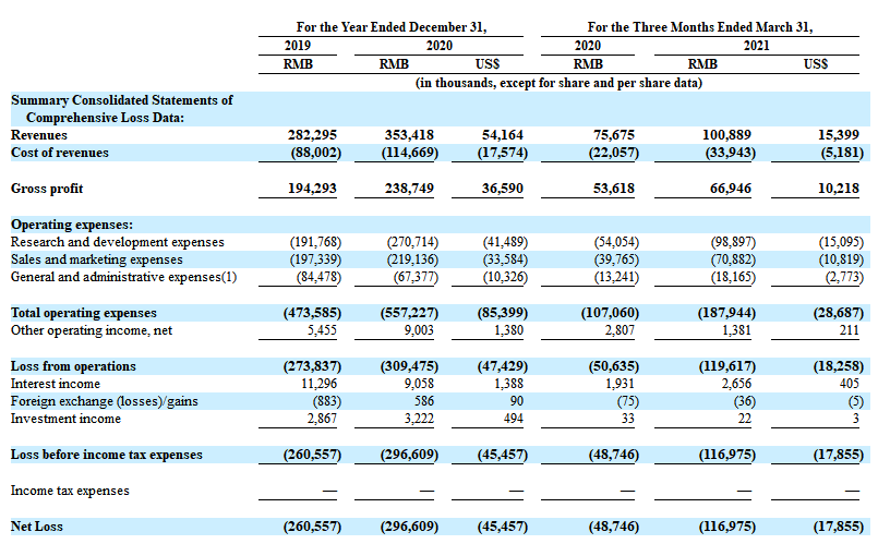 招股书显示,在过去的2019年、2020年和2020年第一季度,群核科技的收入分别为 2.82亿、3.53亿和1.01亿元人民币,相应的净亏损分别为2.61亿、2.91亿和1.17亿元人民币。