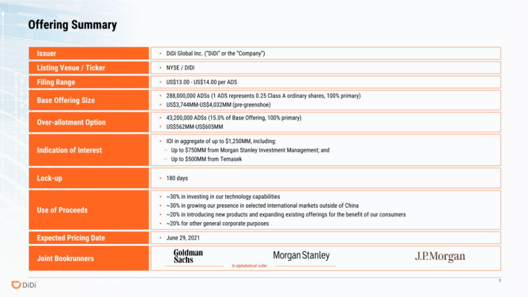 滴滴出行(DIDI)计划以每股13至14美元发行2.88亿份美国存托股票(ADS),高盛、摩根士丹利和摩根大通正牵头滴滴IPO。根据文件,摩根士丹利、新加坡淡马锡控股的附属公司已分别同意认购不超过7.5亿美元、5亿美元。
