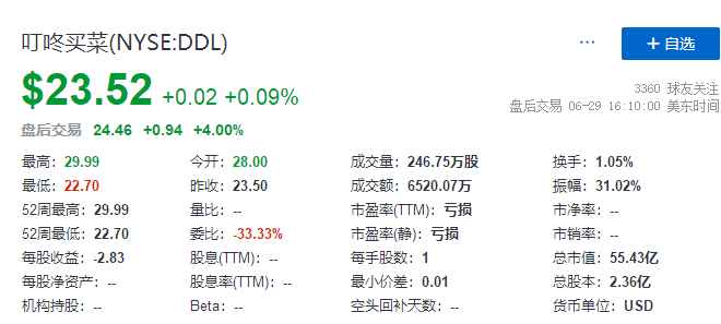 截至首日收市时间,叮咚买菜收报 23.52美元,较发行价涨0.09%,目前其总市值55.43亿美元。
