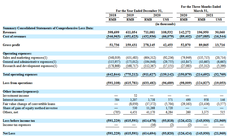 招股书显示,在过去的2018年、2019年、2020年和2021年第一季度,天鹅到家的收入分别为 3.99亿、6.11亿、7.11亿和 1.97亿元人民币,相应的净亏损分别为5.91亿、6.16亿、6.15亿和1.44亿元人民币。