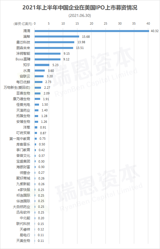 2021年上半年,共有 38 家中国企业在美国IPO上市(不考虑SPAC、OTC上市),共募资 135.37亿(美元,下同) , 其中 24 家在纳斯达克上市、14 家在美国纽交所上市。