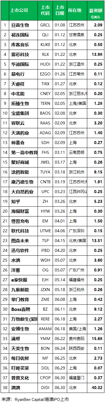 这 IPO上市的 38 家,共募资 135.37亿美元,平均每家募资3.56亿美元。