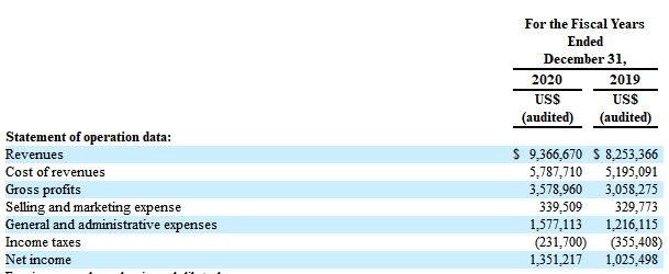 招股书显示,在过去的2019年、2020年,柯普尼的收入分别为 825.34万、936.67万美元,相应的净利润分别为 102.55万、135.12万美元。