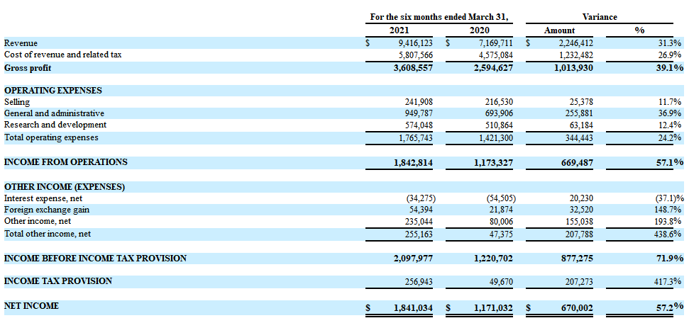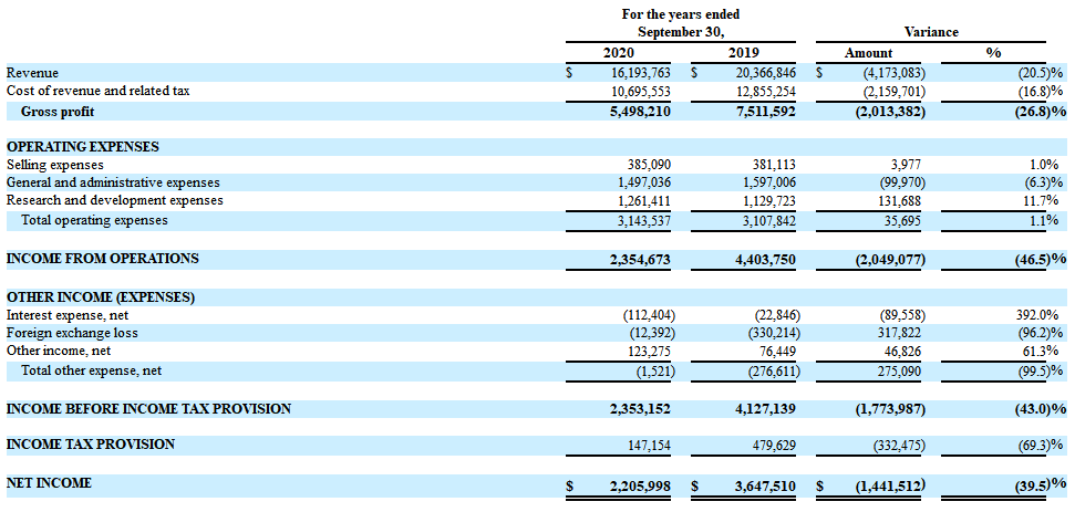 招股书显示,在过去的2019年、2020年两个财政年度(财政年度截止日期为9月30日)和2021年度前六个月(截至2021年3月31日),中进医疗的收入分别为 2,036.68万、1,619.38万和941.61万美元,相应的净利润分别为 364.75万、220.60万和184.10万美元。