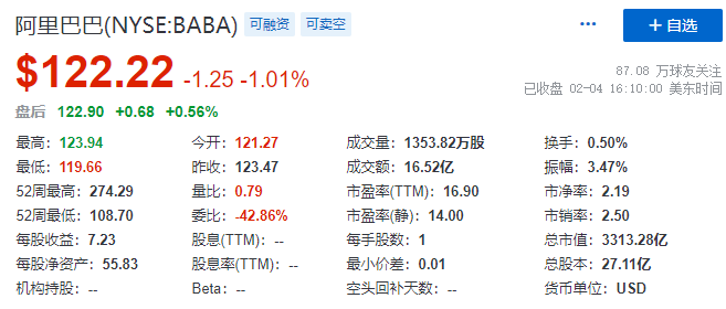 截至2022年2月4日,阿里巴巴(BABA)收报122.22美元,总市值约3313.28亿美元。