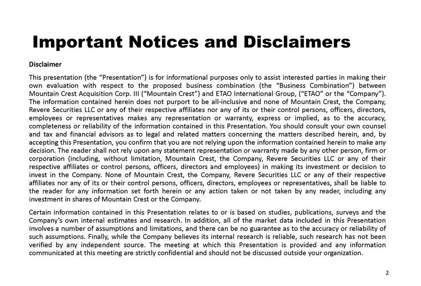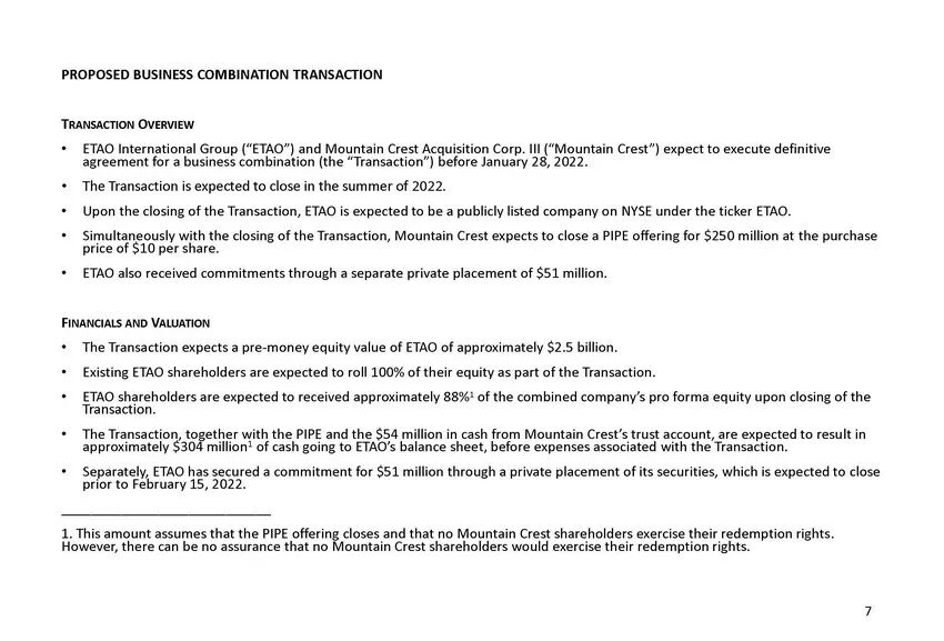 Merger Agreement dated January 27, 2022 by and between Mountain Crest Acquisition Corp. III, ETAO International Group, and Wensheng Liu, in his capacity as the Company Shareholders’ Representative