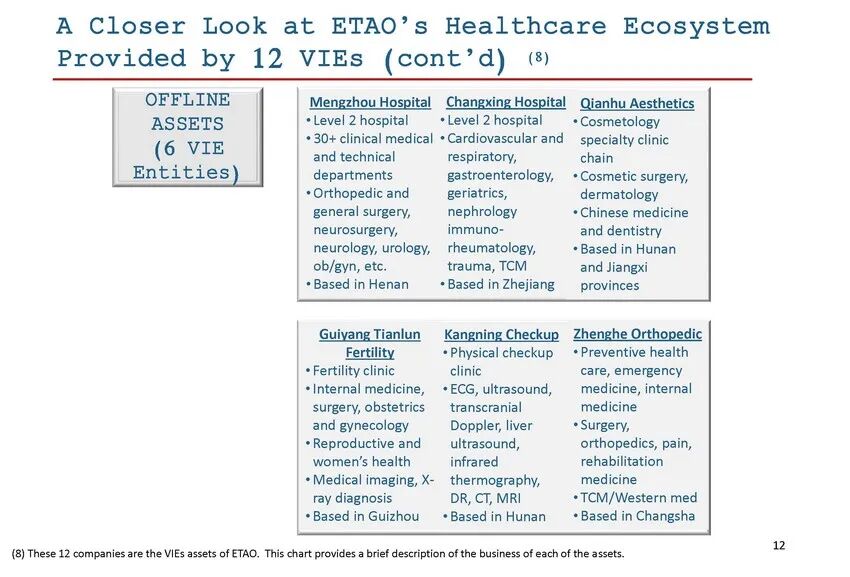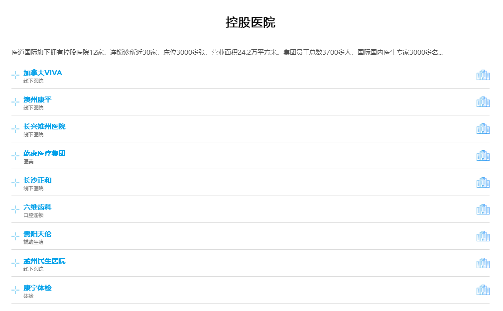 线下医院主要涵盖数字牙科连锁(杭州六维)、医美连锁医院集团(乾虎医疗集团)、生殖连锁医院(贵阳天伦等)、几家综合医疗机构(包括孟州民生医院、长兴雉州医院、康宁体检等);