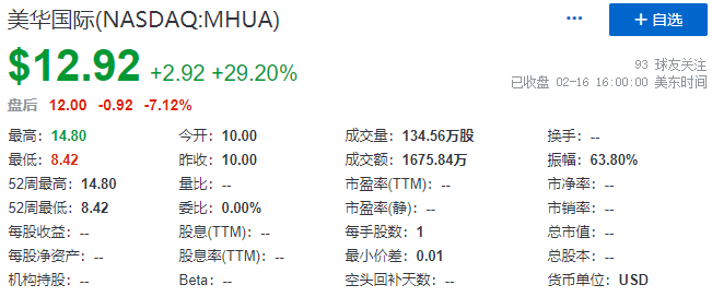截至首日(2月16日)收市时间,美华国际医疗每股收报 12.92美元,较发行价涨29.20%,目前其总市值3.23亿美元。
