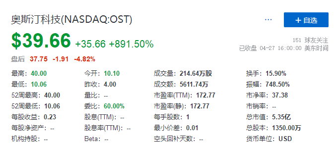 截至首日(4月27日)收市时间,奥斯汀科技每股收报 39.66美元,较发行价涨891.50%,目前其总市值5.35亿美元。
