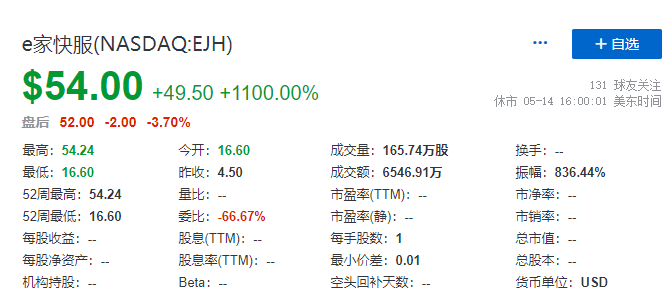 截至首日收市时间,e家快服收报 54.00 美元,较发行价涨11倍,目前其总市值大概18.12亿美元。
