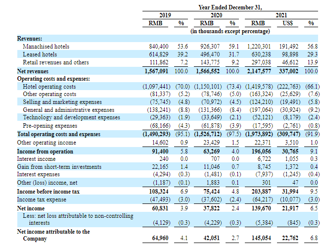 招股书显示,在过去的2019年、2020年和2021年,亚朵酒店的收入分别为15.67亿、15.67亿和 21.48亿元人民币,相应的净利润分别为6,496.0万、4,205.1万和 14,505.4万元人民币。