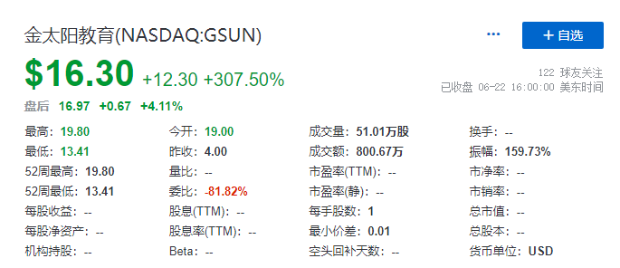 截至首日(6月22日)收市,金太阳教育每股收报16.30美元,较IPO发行价涨307.50%,目前其总市值约 2.84亿美元。