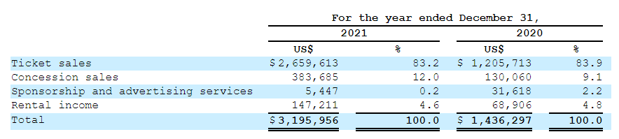 影高文化的收入主要来自广州星梦的电影票房净收入。公司还从 (i) 公司电影院的食品和饮料以及电影商品的特许销售中获得收入;(ii) 其他辅助服务,例如广告服务和赞助安排;(iii) 将电影院场地内的区域或空间转租给第三方商业运营商的租金收入。