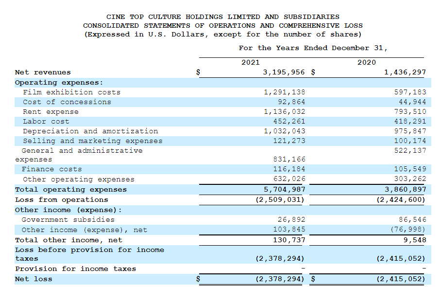 招股书显示,在过去的2020年、2021年两个财政年度,影高文化的收入分别为 143.63万、319.60万美元,相应的净亏损分别为 241.51万、237.83万美元。