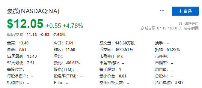 截至首日(7月12日)收市,豪微科技每股收报12.05美元,较IPO发行价涨4.78%,目前其总市值约 6.68亿美元。