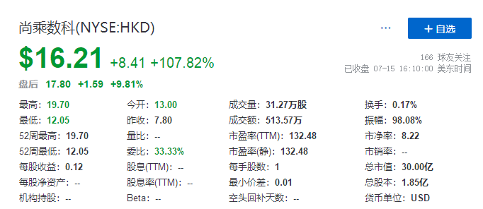 截至首日(7月15日)收市,尚乘数科每股收报16.21美元,较IPO发行价大涨107.82%,其总市值约 30亿美元。