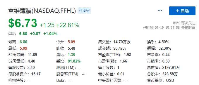 富维薄膜(FFHL),截至昨日(7月19日)收市,其收报6.73美元,大涨22.81%,目前市值为2,197.91万美元。