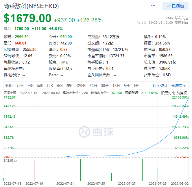尚乘数科(HKD),自7月15日在美国纽交所上市以来,股价升势惊人。