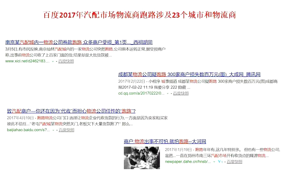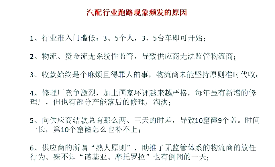 这类物流企业短期可能会得到迅速发展,但是“跑路”是迟早的事情。很多配件经营商户对此心知肚明,但往往抱有侥幸心理,只要不欠我的钱就好,拿别人的钱补我的钱最好。殊不知覆巢之下焉有完卵,别人的今天往往就是你的明天。