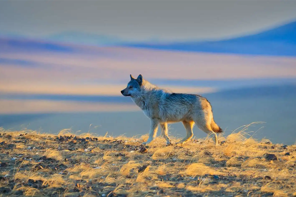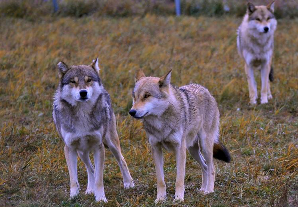 不远处的山丘上,先冒出了1只狼,站在高处瞭望、徘徊。没一会儿,又出现了第2只狼,第3只狼。
