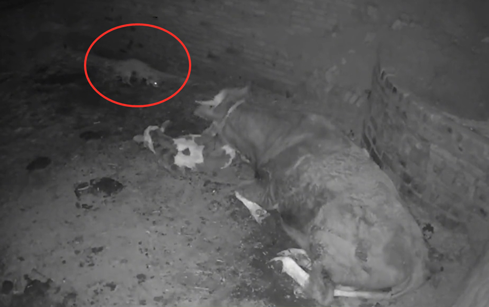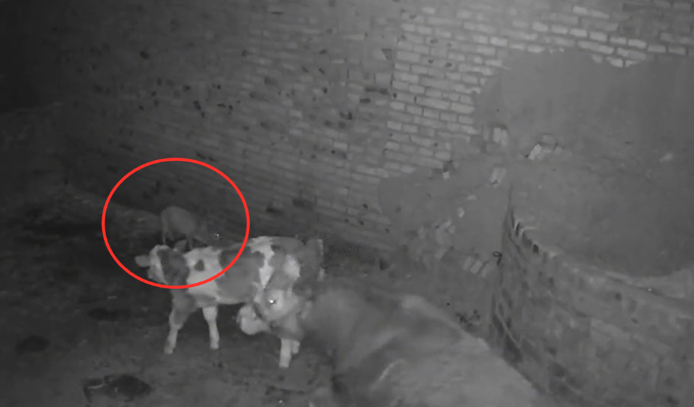 主人从监控里看到这一幕,打着手电筒过来查看,只见母牛和小牛,还站着一起,保持着警惕,牛犊很平安,没有被狼伤到。