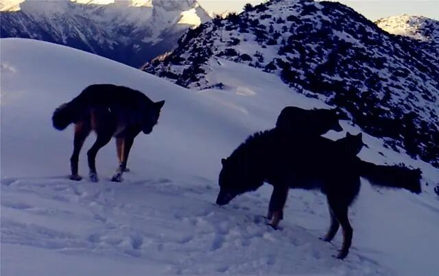 可狼的行为有点奇怪,它们也许是嗅到了猞猁气味标志,在原地转了好几圈,还互相“商量”了一会儿。