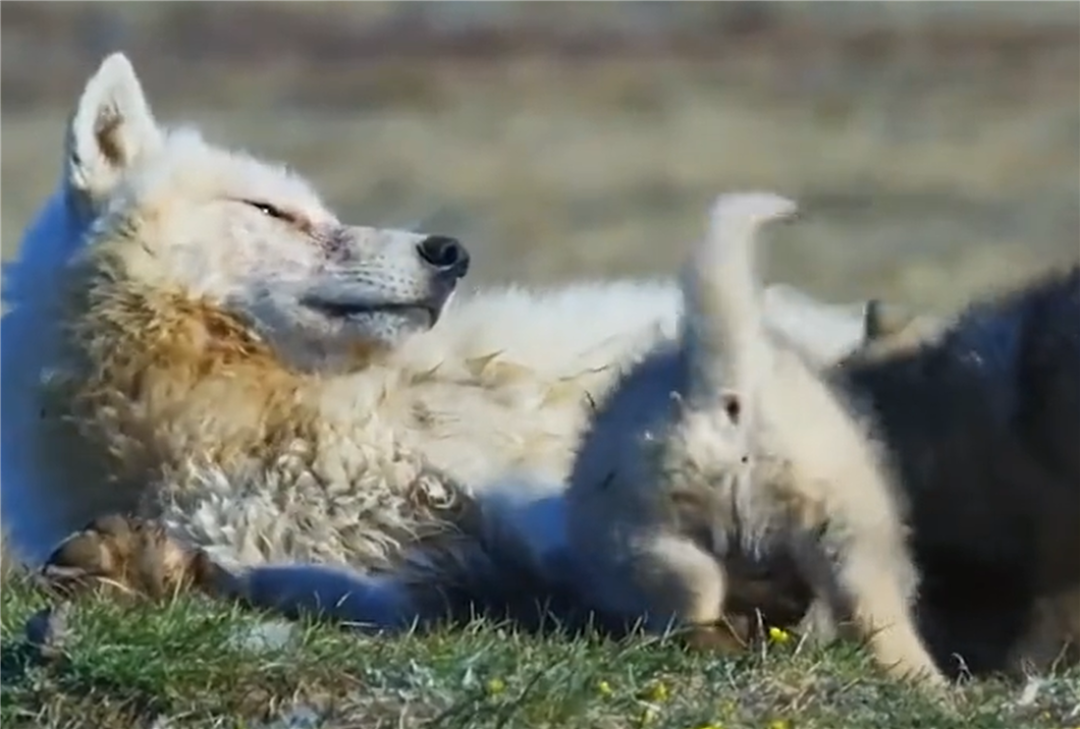 你要知道,头狼是不会放弃自己的幼崽的,她将2只幼崽委托给其它的母狼,让她担负起代理妈妈的角色,以便给狼崽喂奶。小狼崽估计饿极了,扑在母狼的身边吃起奶来。