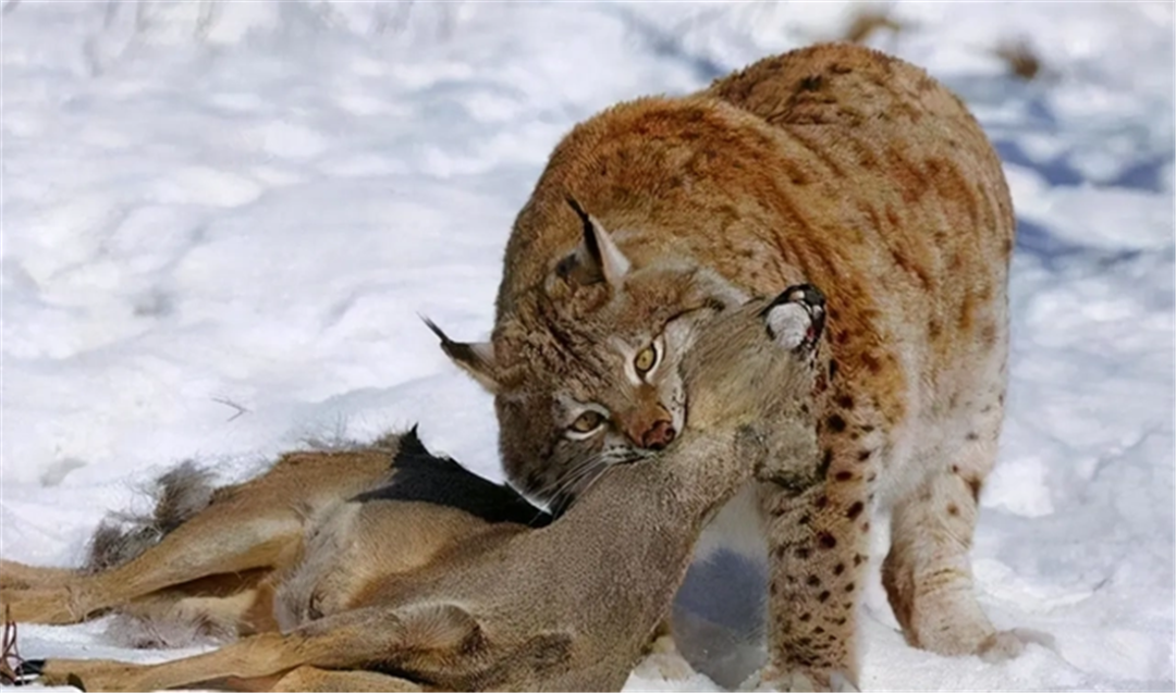 猞猁可不像狼,后腿一蹬地,跳进母羊群中,不费吹灰之力,便咬住了1只母羚羊。别的母羚羊不知道是被吓到了,还是别的原因,吓得赶紧逃跑。