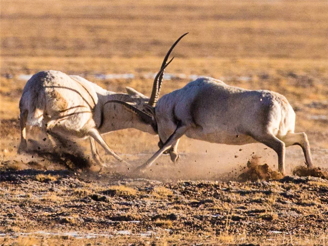 玉珠峰下草原上,每年冬季,随处可见决斗的公藏羚羊。为了脱单之旅,公藏羚羊还特地脱掉土黄色的外套,换上精致的黑白分明的礼服,到处寻找着情敌,两两相斗。
