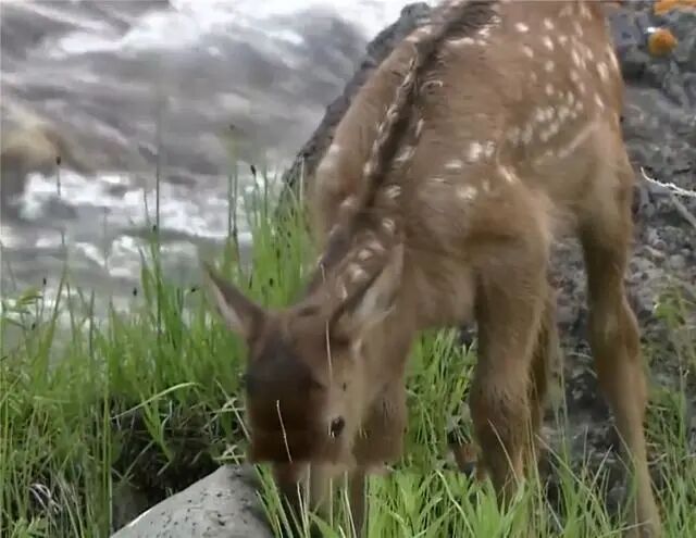 母鹿这回并没有惊慌失措,看起来倒是很淡定。它先把小赤鹿藏在河里的一片深草丛中,好像还耳语了一番,意思是让小赤鹿藏好,不管发生什么事情,都不要走出来。