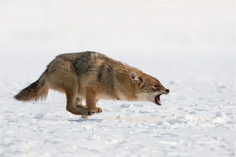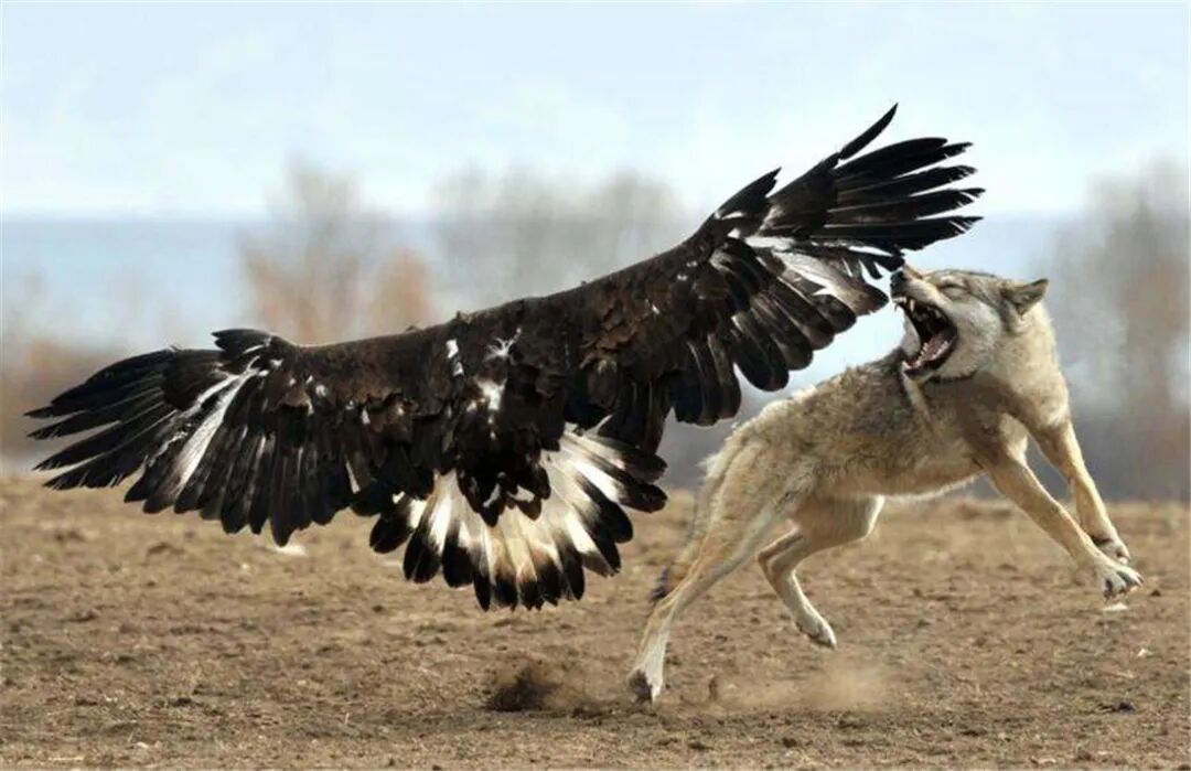 这只狼只能眼睁睁地看着到嘴的猎物,被金雕半路截走。一只成年金雕的战斗力很强,就算狼再不甘心也只能自认倒霉,灰溜溜地再去寻找别的食物填肚子。