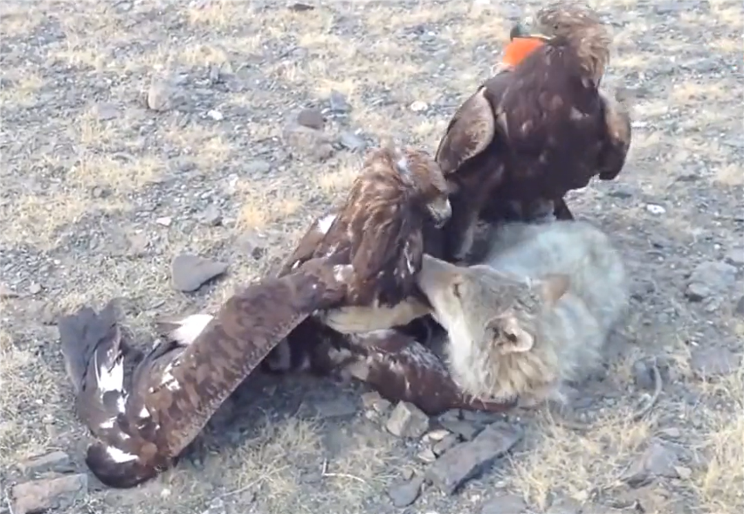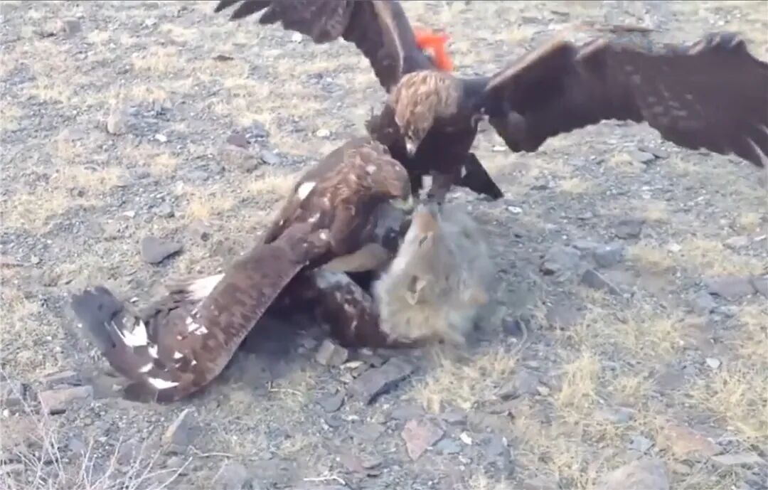 一只金雕用爪子掰开狼的嘴,使它无法再用狼牙去咬;另一只金雕不停地啄它的眼睛,没过多久,这只狼就再也没有力气反抗了,眼睛也被啄瞎了。