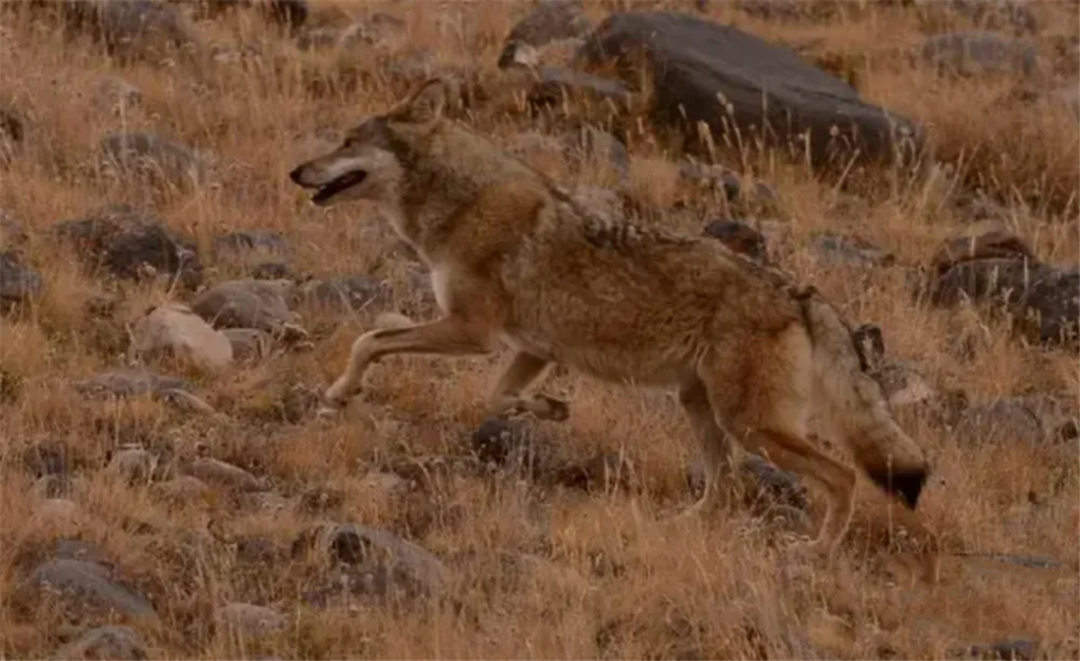纪录片中拍摄到一段狼追捕盘羊的惊险画面。一只盘羊偶遇一群天山狼,吓得没命地逃跑,狼群散开,3匹狼往旁边跑了,2匹狼却一直紧追其后。