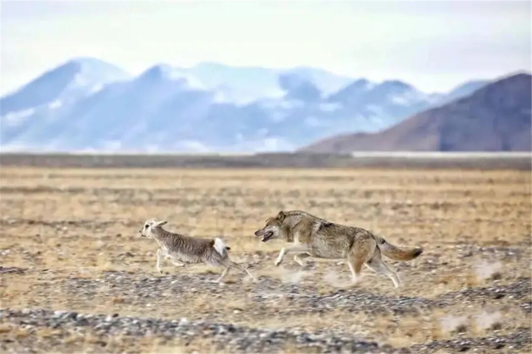 母岩羊也早有准备,急忙往前面跑,狼拼命在后面追,眼看狼就要抓住母岩羊了,十分惊险。