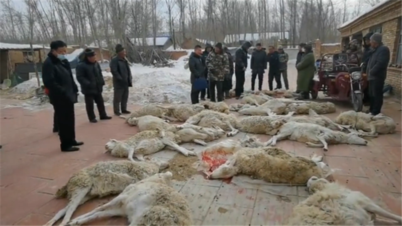 这被狼咬死的26只羊,横七竖八躺地上。有的被吃掉了,只剩个脑袋,有的还四肢健全。